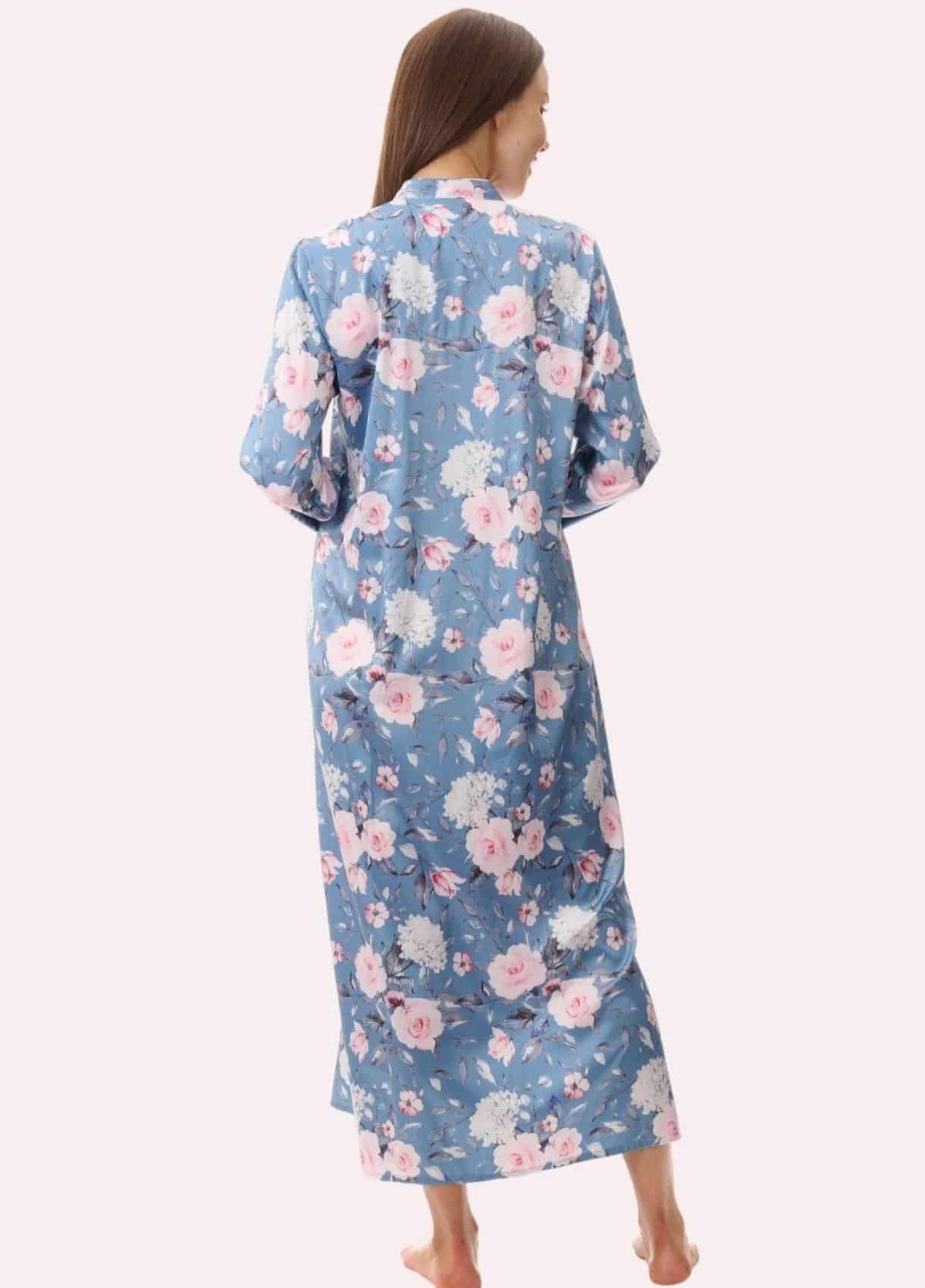 Long kaftan with long sleeves in the dreamy “Jaclyn” floral print on stretch satin. Shaped neckline with flat navy piping trim. Front zip opening with tassel and side splits at hem.