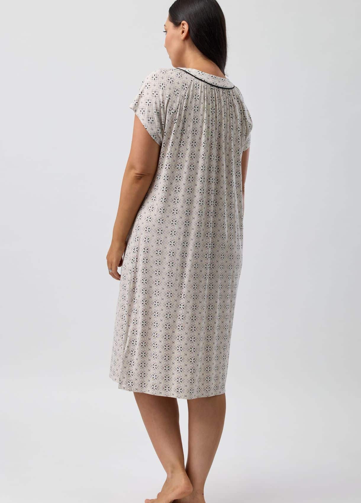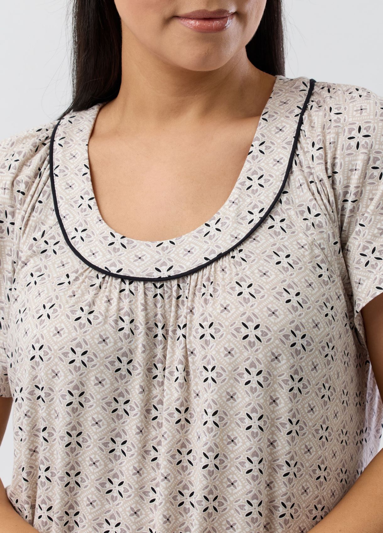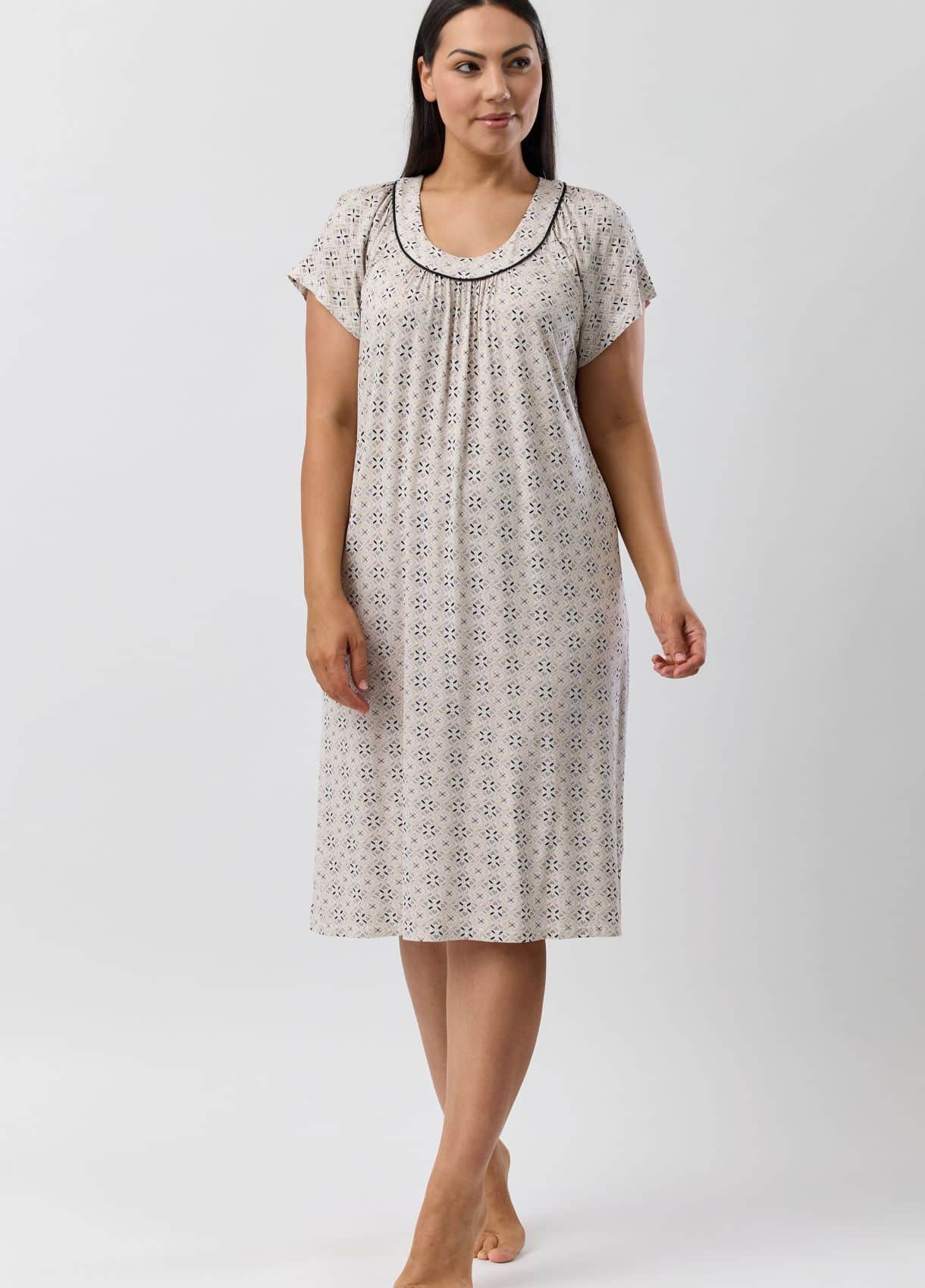 The Kenya Nightie exudes sophistication with its silky, soft viscose jersey fabric and elegant batik print. Featuring a flattering scoop neck detailed with contrast piping, this nightie offers a refined yet comfortable fit, perfect for stylish relaxation and peaceful nights.