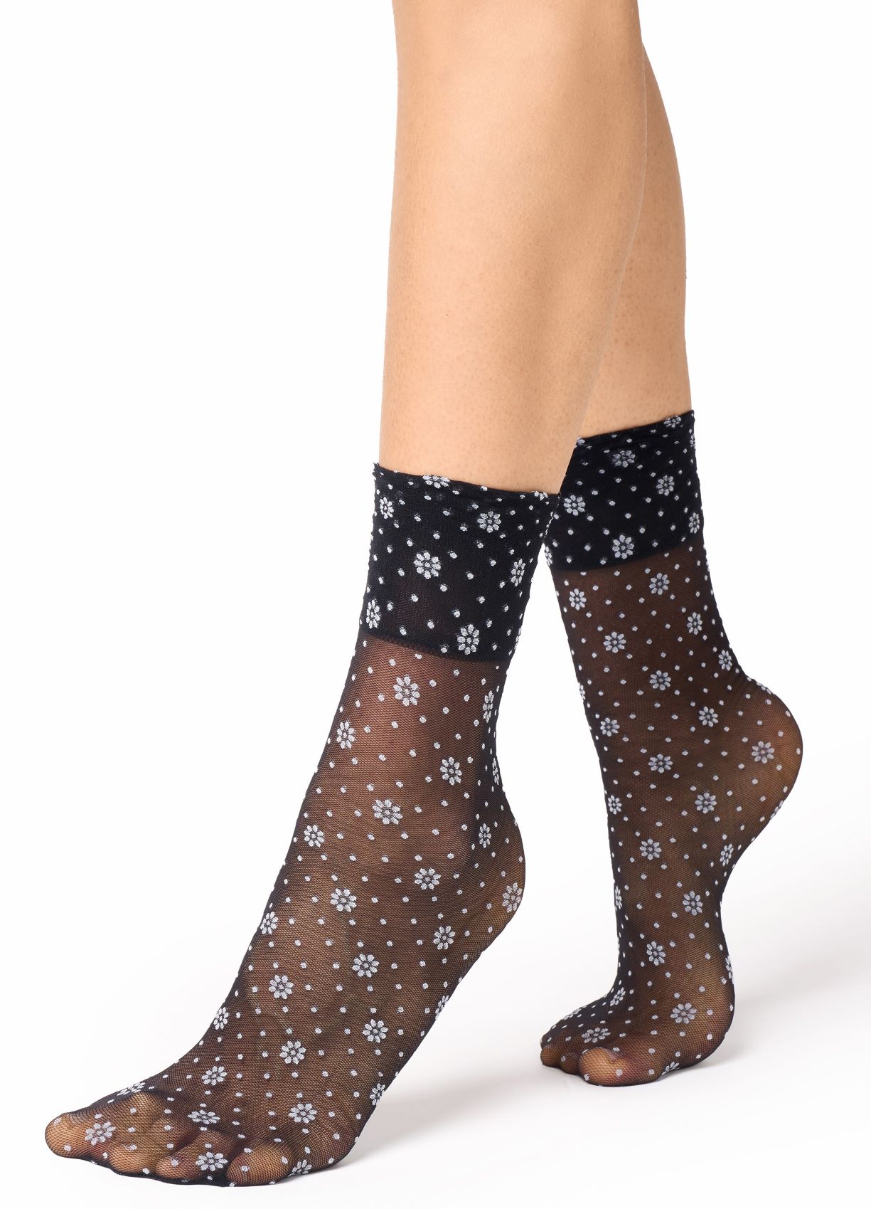 • Sheer light mesh hosiery with daisy/spot detail