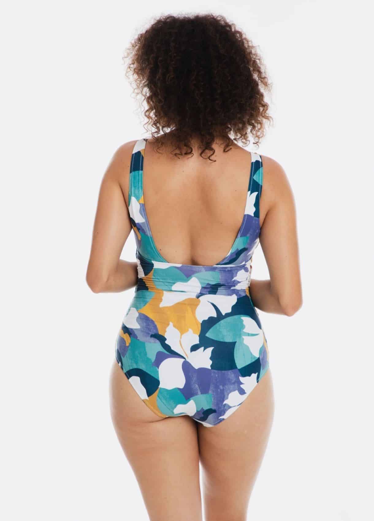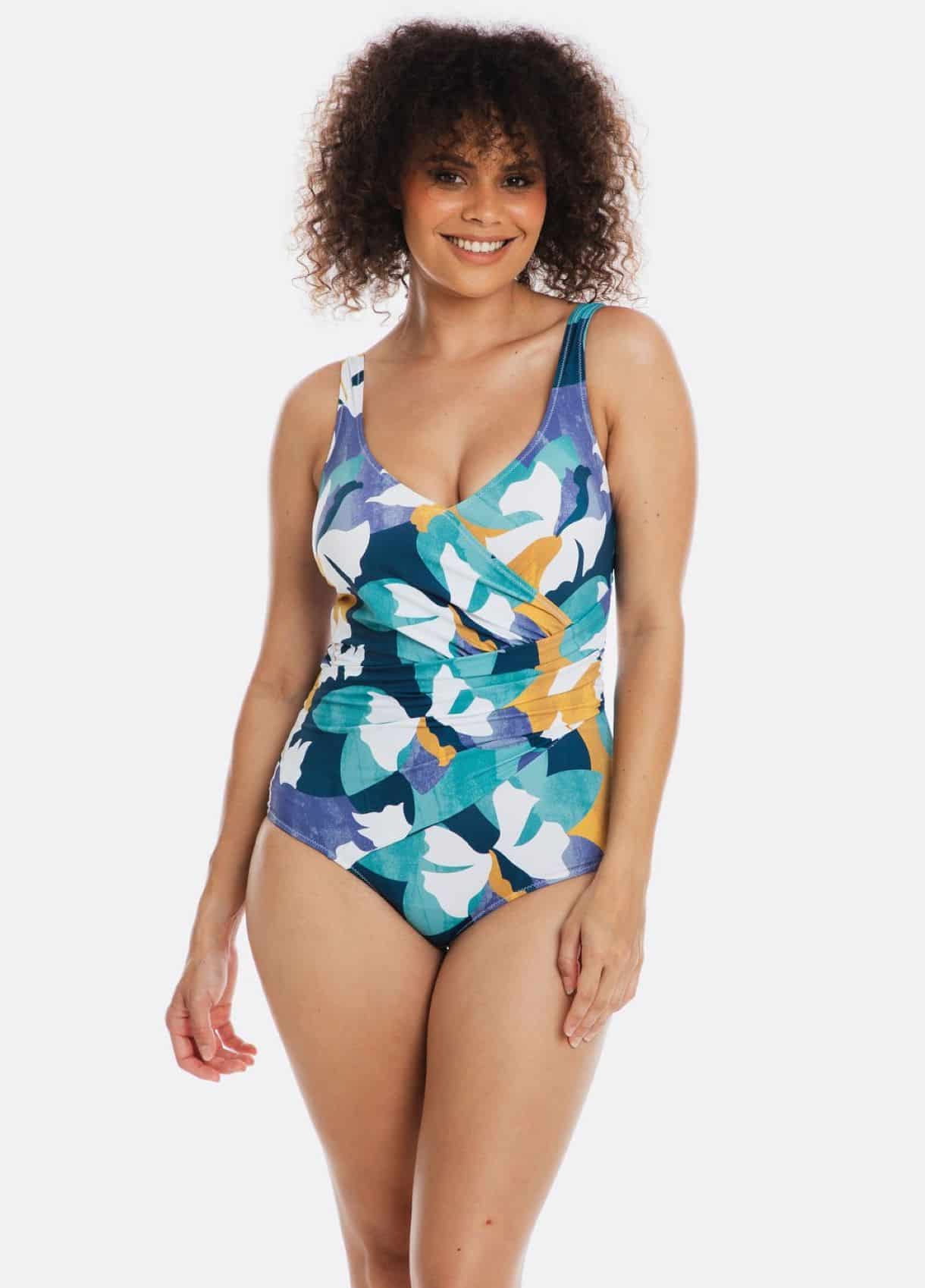 A Togs classic crossover one-piece swimsuit. This elegant swimsuit features 3-way ruching, creating a flattering silhouette that enhances your natural curves. Designed with wire-free support, it offers both comfort and freedom of movement, making it perfect for any water activity.