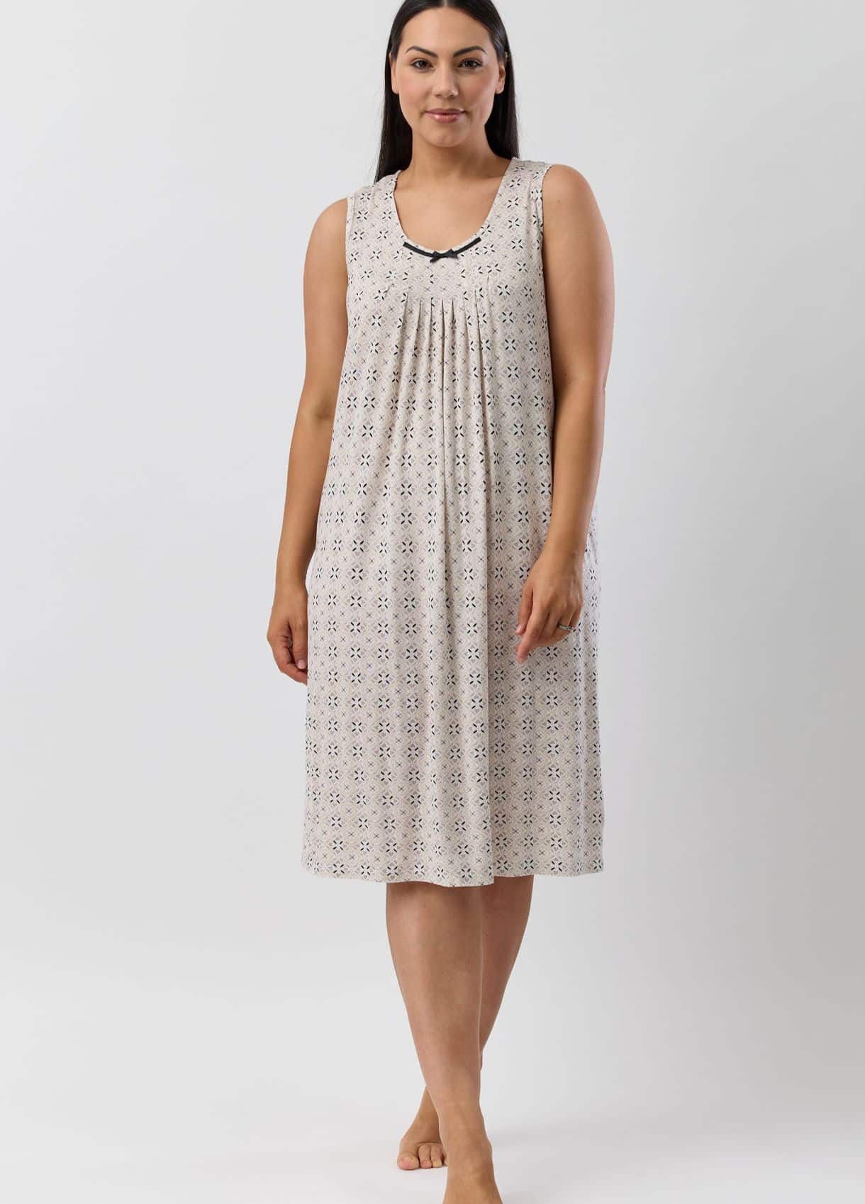 The Kenya Sleeveless Nightie offers a sophisticated silhouette crafted from silky, soft viscose jersey. Its sleeveless design is elevated by delicate grosgrain ribbon trim and refined pleating, creating an elegant and comfortable piece perfect for graceful evenings and tranquil nights.